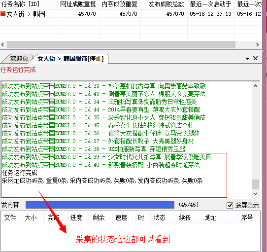 四、每个采集进程都有独立的窗口可以观看采集的进度和发布的进度以及各类详细数据,很简单的就可以看到你采集的内容成功与否。