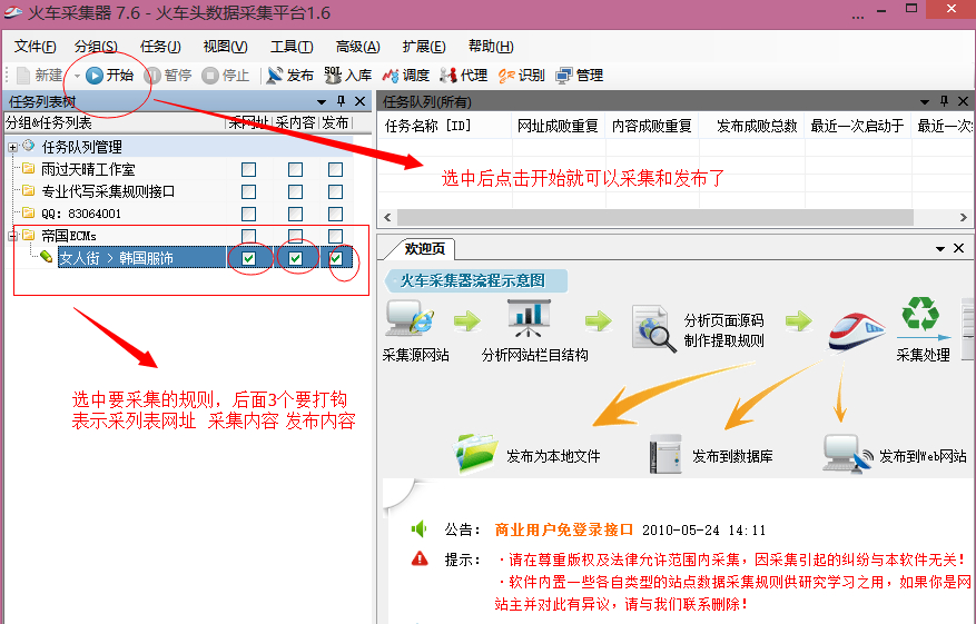 三、打开主界面后,就可以去采集了,选择好你的采集规则,直接点击开始 进行采集发布(前提是都已经配置好了)