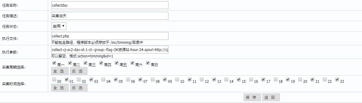 例如:http://localhost/admin/?m=collect-cj-ac2-day-hour-24-xt-1-ct--group--flag-110_-apiurl-http://www.bdzy.cc/xml/caiji.asp