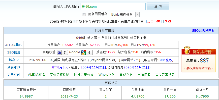 圈内最著名的网站目录应该属于0460网址之家,一个由民间组织搞的存放在境外(美国)连备案都没有的网站,一跃成为网站目录的新星,这个是百度绿萝算法的受益者之一,大家看看他的alexa曲线排名,最明显的就是从13年百度绿萝算法上线的那个变化。