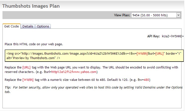 第四步:获取网站缩略图API,黄色区域所提供的代码就是调用代码了