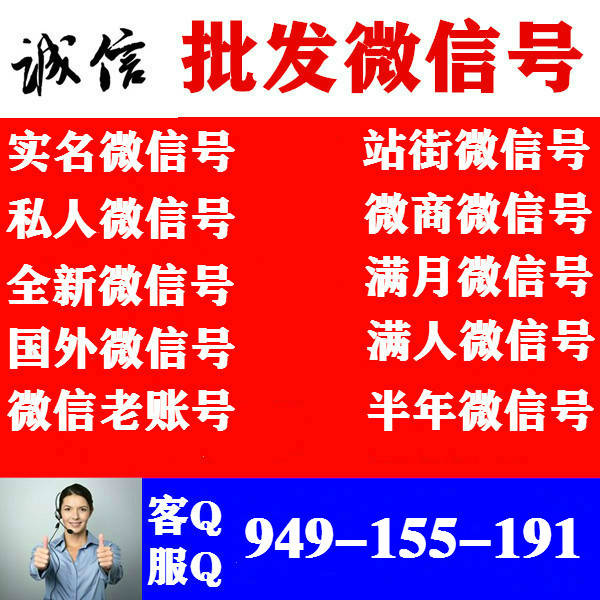【咨询QQ:949-155-191】可以进入平台查看:www.weixin324.com 微售网,微信号出售,买微信号安全持久,,微信号批发平台,带朋友圈、手工、批发、微信号多少钱一个、淘宝、价格。微信号购买请认准微售网,出售国内外空号、站街、老号、半月、满月微信号,站街号,实名绑卡微信号,国内国外微信号,保证买卖微信小号一手渠道,微信号购买批发平台,大量现货,平台大,安全持久微信号批发出售。对于想用站街号做项目的老铁们来说,刚注册出来的微信帐号根本不能用,必须要购买或者使用那些老号才行。如果要自己把新号养成老号使用,这多麻烦呀?所以现在有些专门就是在卖微信老号,可是我们也不一定确定的说他们卖的就是老号,从他们手里出的都能用是吧!
