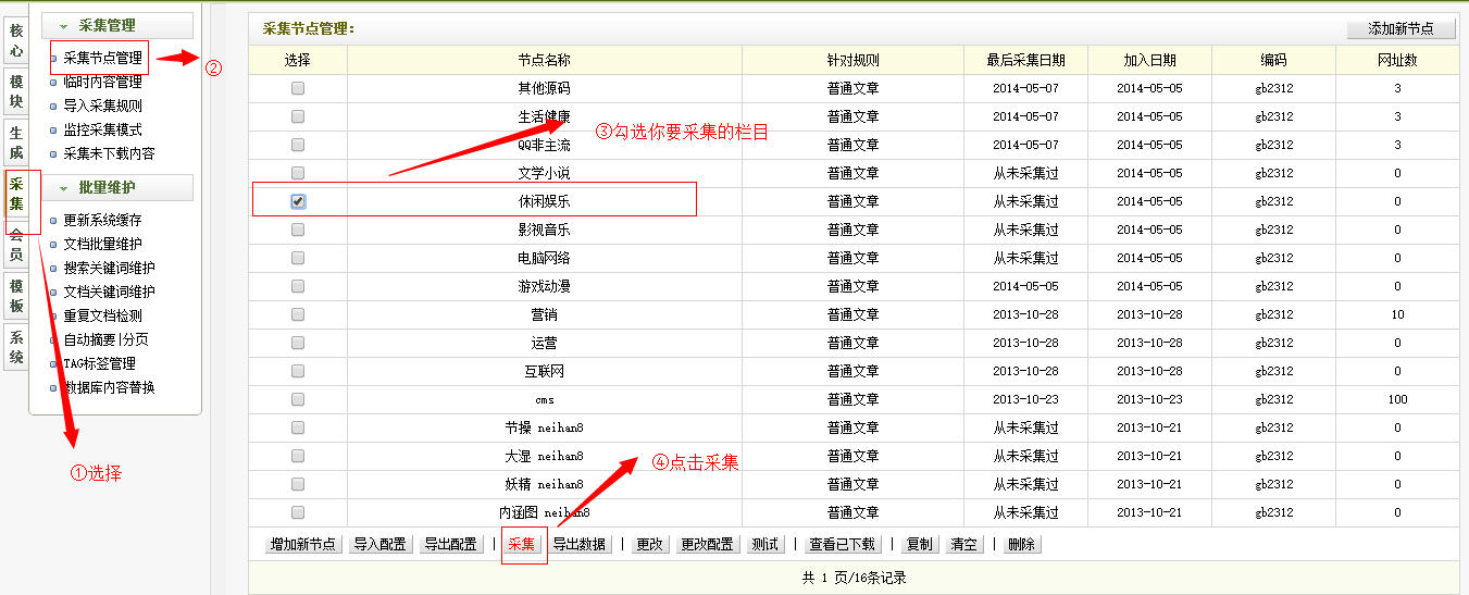 1、进入后台,选择侧边导航的采集---采集管理--采集节点管理,选择你要采集的规则,然后点击采集。
